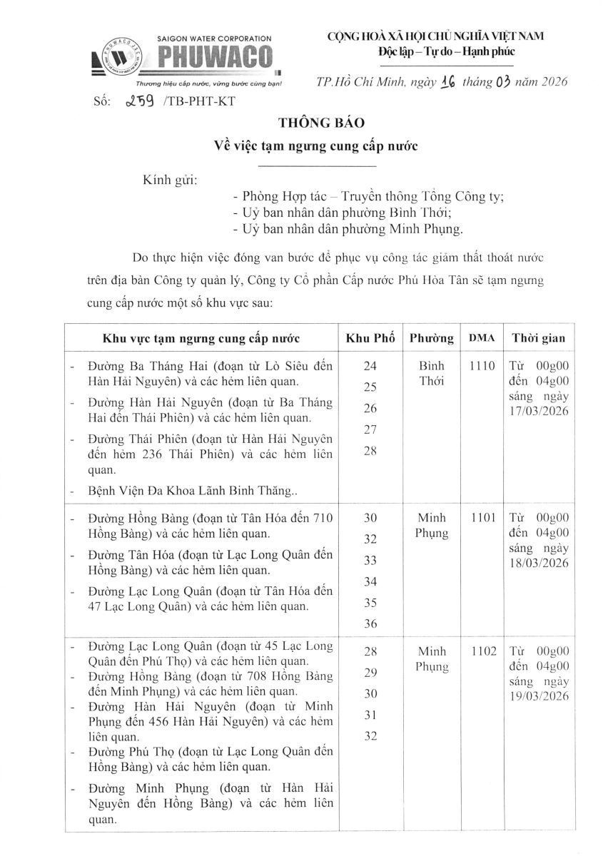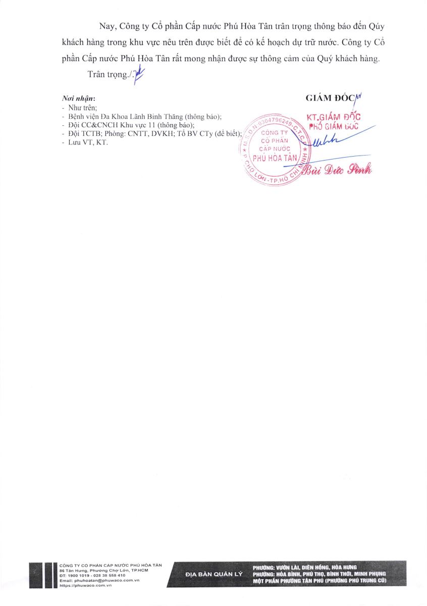 Công ty Cổ phần Cấp nước Phú Hòa Tân trân trọng thông báo Quý khách hàng được biết để có kế hoạch dự trữ nước phục vụ cho sản xuất và sinh hoạt. Công ty rất mong nhận được sự thông cảm của Quý khách hàng./.