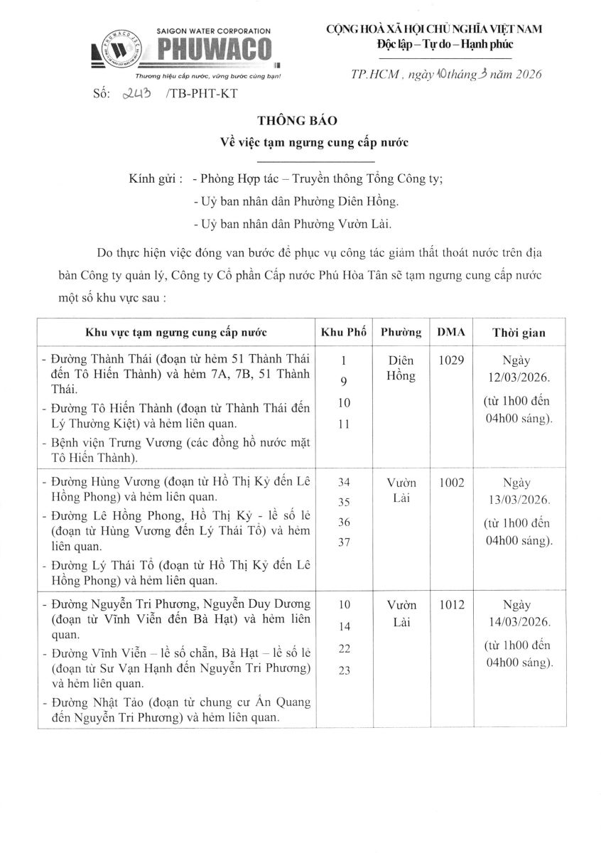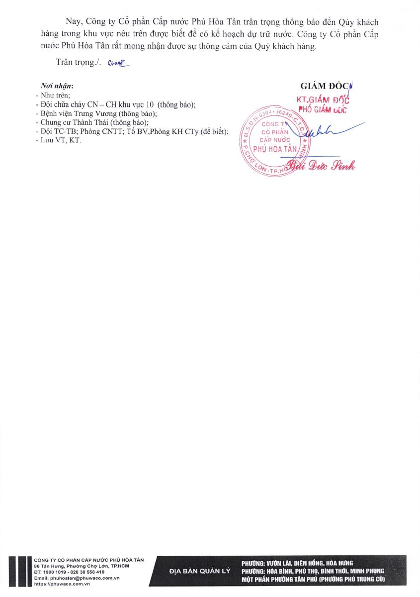 Công ty Cổ phần Cấp nước Phú Hòa Tân trân trọng thông báo Quý khách hàng được biết để có kế hoạch dự trữ nước phục vụ cho sản xuất và sinh hoạt. Công ty rất mong nhận được sự thông cảm của Quý khách hàng./.