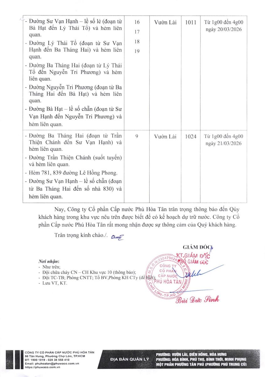Thông báo tạm ngưng cung cấp nước phường Hòa Hưng, Vườn Lài, Diên Hồng
