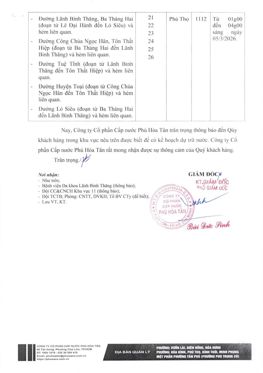 Công ty Cổ phần Cấp nước Phú Hòa Tân trân trọng thông báo Quý khách hàng được biết để có kế hoạch dự trữ nước phục vụ cho sản xuất và sinh hoạt. Công ty rất mong nhận được sự thông cảm của Quý khách hàng./.