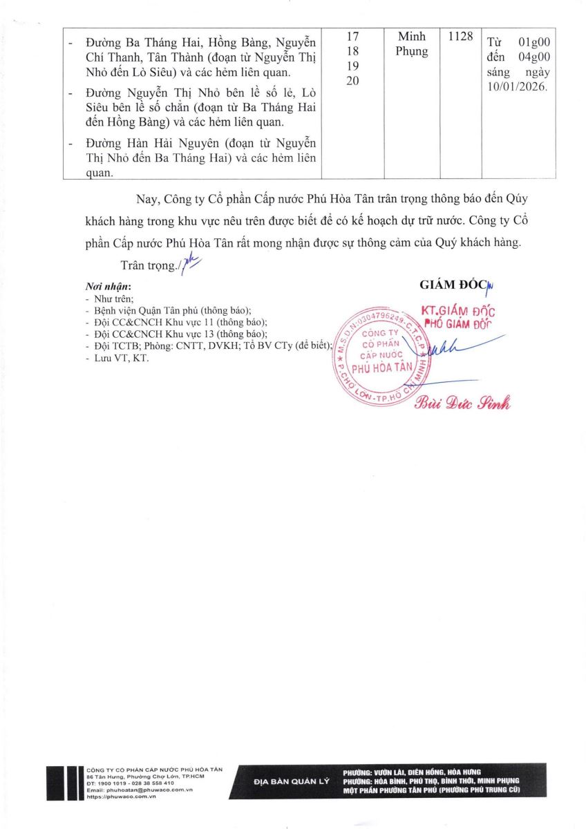 Công ty Cổ phần Cấp nước Phú Hòa Tân trân trọng thông báo Quý khách hàng được biết để có kế hoạch dự trữ nước phục vụ cho sản xuất và sinh hoạt. Công ty rất mong nhận được sự thông cảm của Quý khách hàng./.