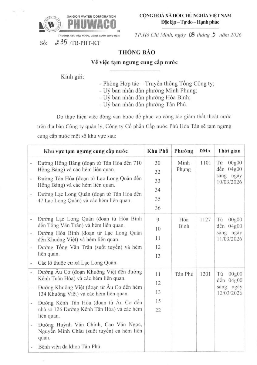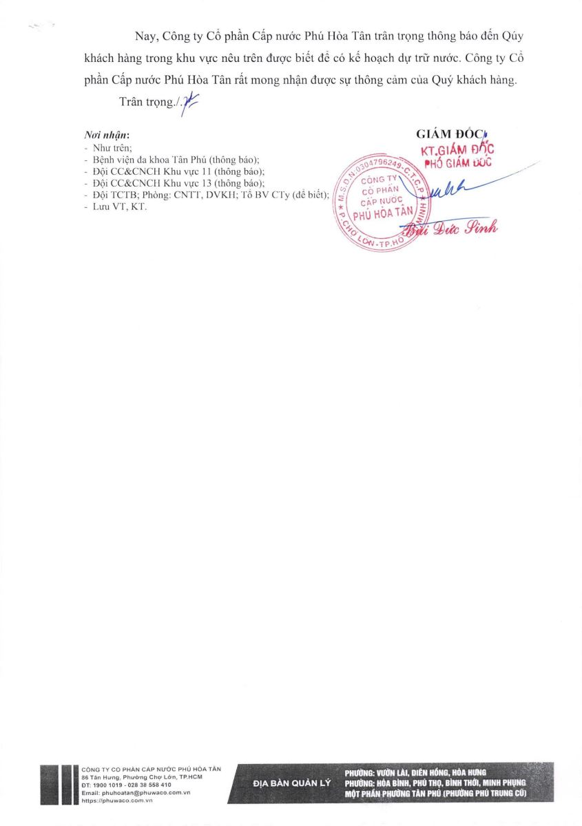 Công ty Cổ phần Cấp nước Phú Hòa Tân trân trọng thông báo Quý khách hàng được biết để có kế hoạch dự trữ nước phục vụ cho sản xuất và sinh hoạt. Công ty rất mong nhận được sự thông cảm của Quý khách hàng./.