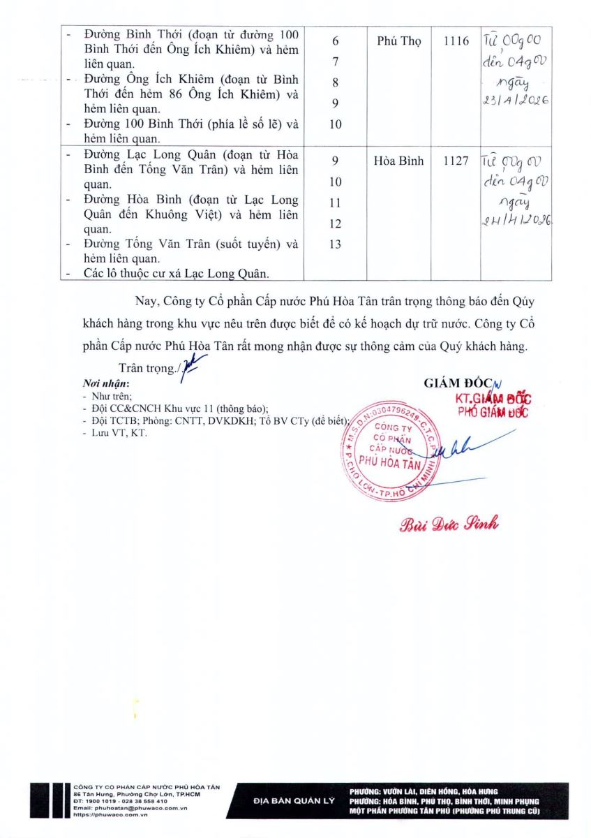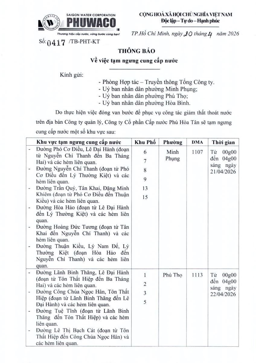 Công ty Cổ phần Cấp nước Phú Hòa Tân trân trọng thông báo Quý khách hàng được biết để có kế hoạch dự trữ nước phục vụ cho sản xuất và sinh hoạt. Công ty rất mong nhận được sự thông cảm của Quý khách hàng./.