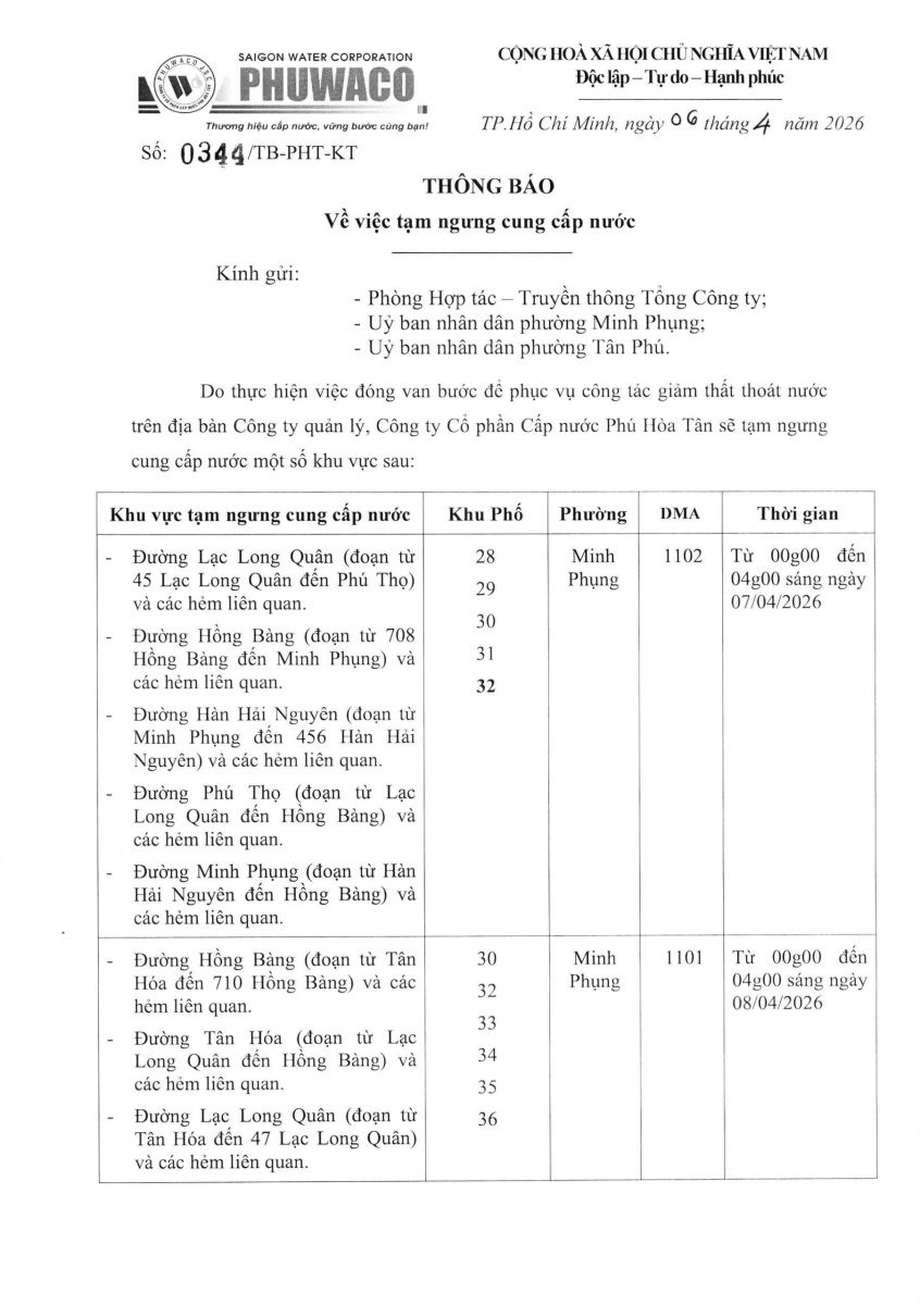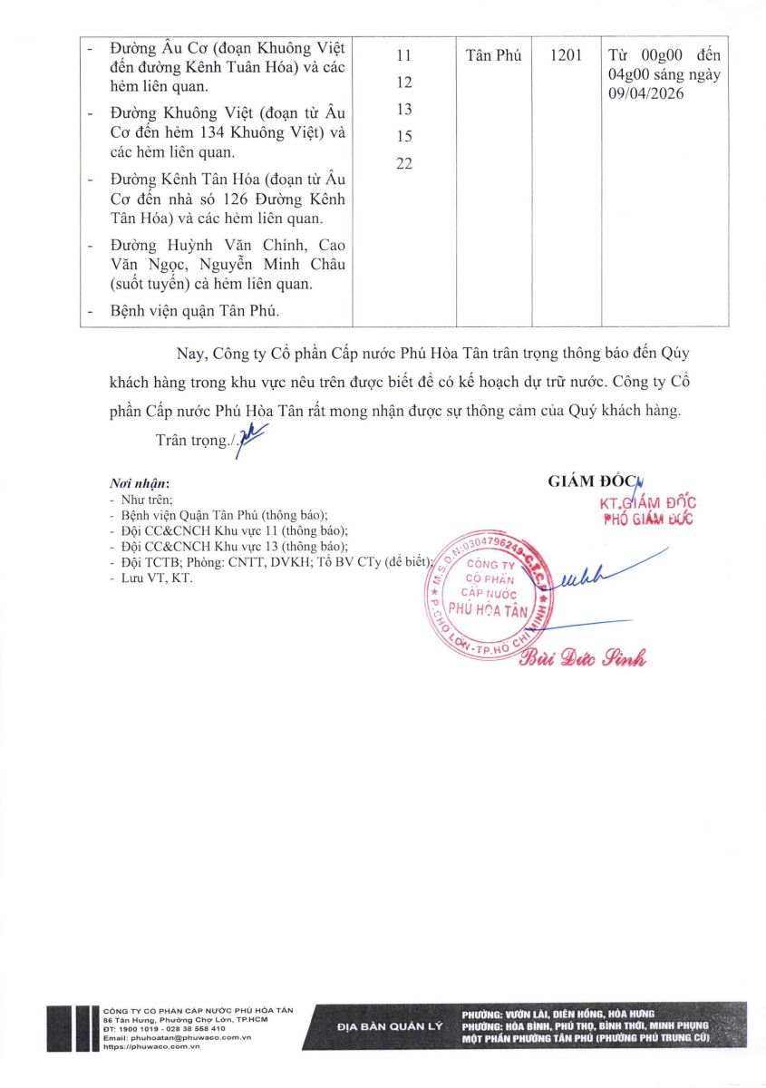 Công ty Cổ phần Cấp nước Phú Hòa Tân trân trọng thông báo Quý khách hàng được biết để có kế hoạch dự trữ nước phục vụ cho sản xuất và sinh hoạt. Công ty rất mong nhận được sự thông cảm của Quý khách hàng./.