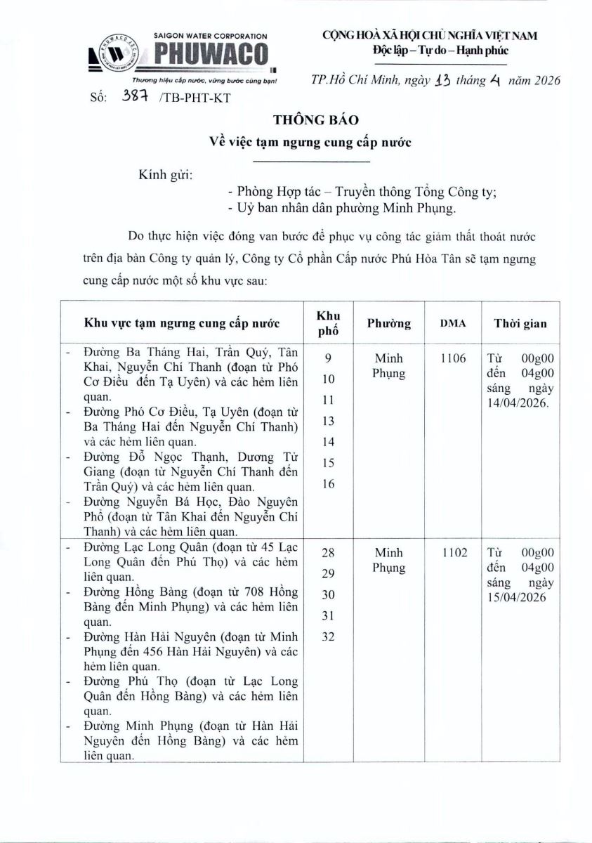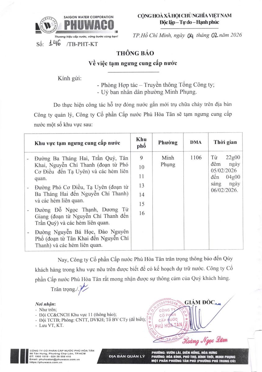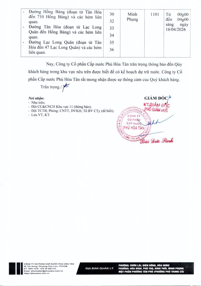 Công ty Cổ phần Cấp nước Phú Hòa Tân trân trọng thông báo Quý khách hàng được biết để có kế hoạch dự trữ nước phục vụ cho sản xuất và sinh hoạt. Công ty rất mong nhận được sự thông cảm của Quý khách hàng./.