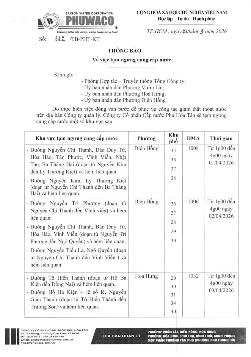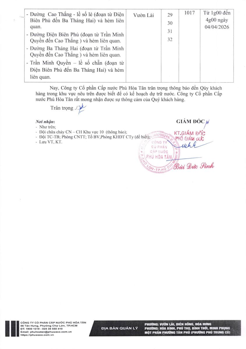 Công ty Cổ phần Cấp nước Phú Hòa Tân trân trọng thông báo Quý khách hàng được biết để có kế hoạch dự trữ nước phục vụ cho sản xuất và sinh hoạt. Công ty rất mong nhận được sự thông cảm của Quý khách hàng./.