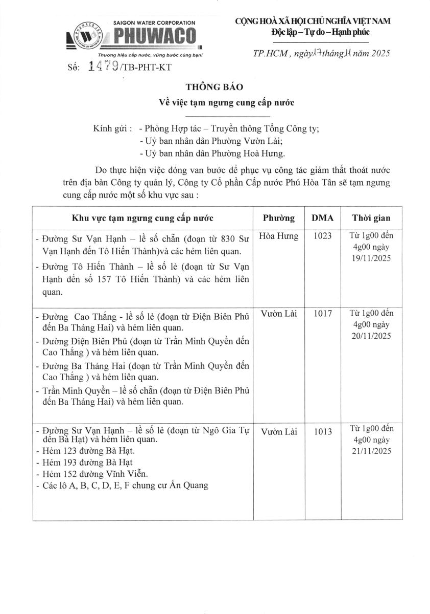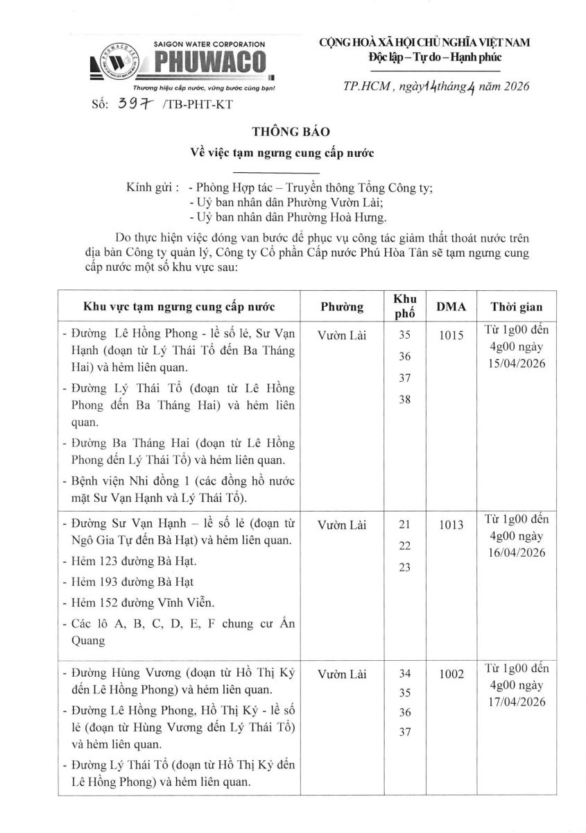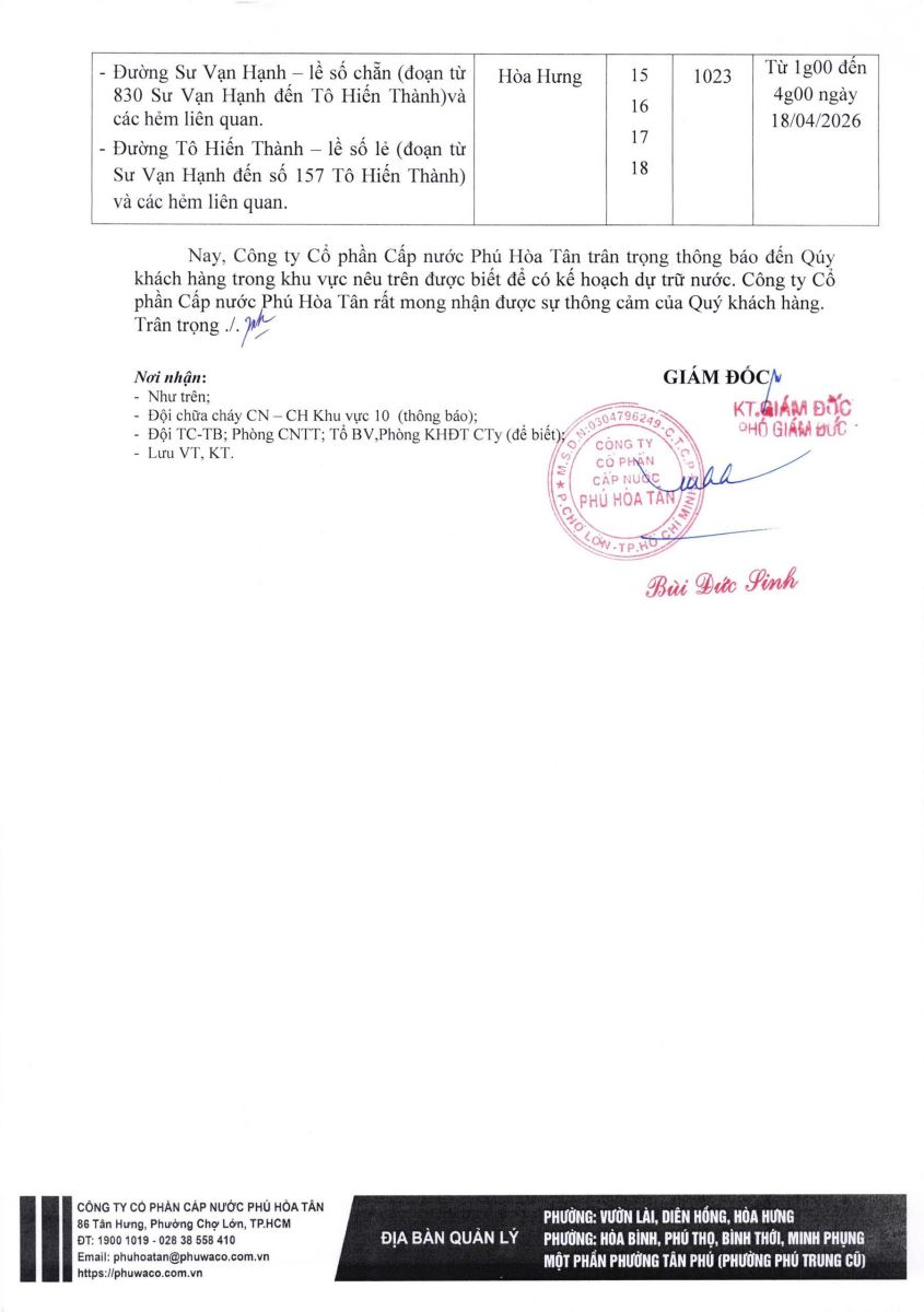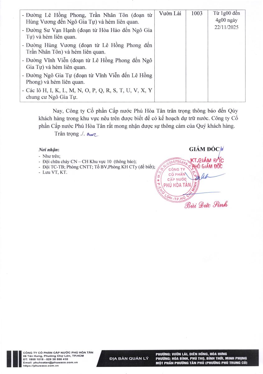 Công ty Cổ phần Cấp nước Phú Hòa Tân trân trọng thông báo Quý khách hàng được biết để có kế hoạch dự trữ nước phục vụ cho sản xuất và sinh hoạt. Công ty rất mong nhận được sự thông cảm của Quý khách hàng./.